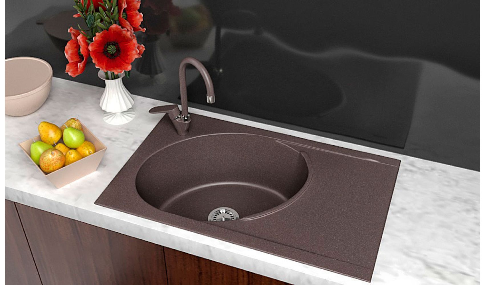 Теги: прямоугольная мойка, коричневая мойка, кухонная мойка с одной чашей, кухонная мойка с крылом, гранитная кухонная мойка, мойка + кран