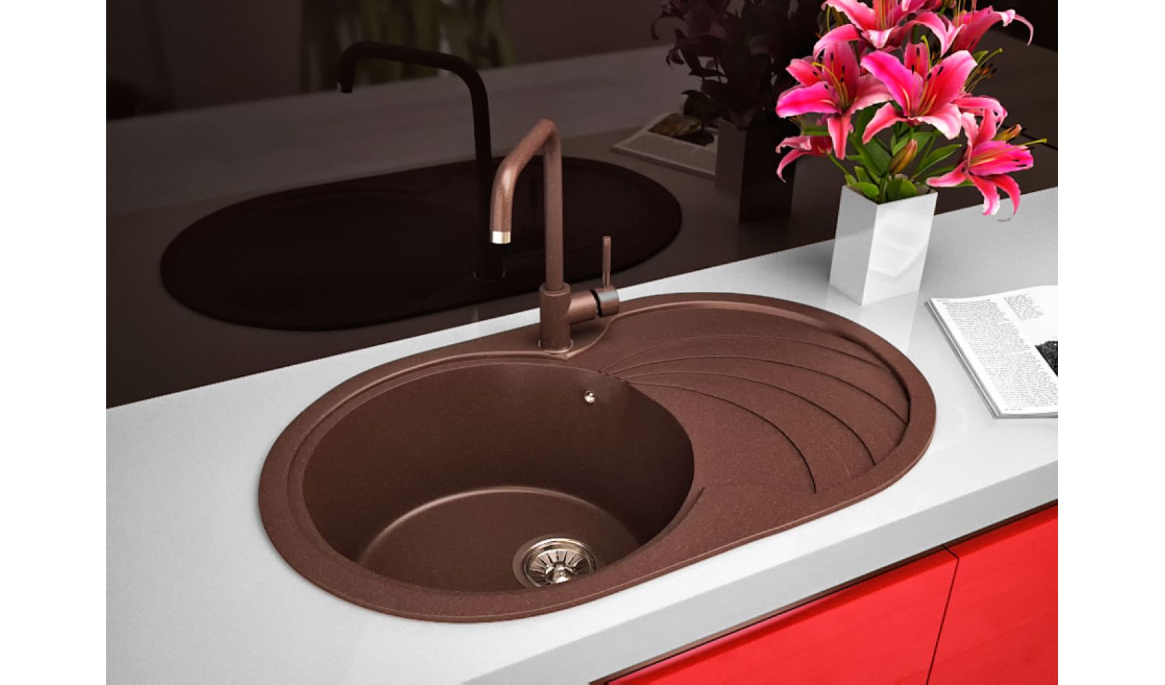 Теги: овальная мойка, коричневая мойка, кухонная мойка с одной чашей, кухонная мойка с крылом, гранитная кухонная мойка