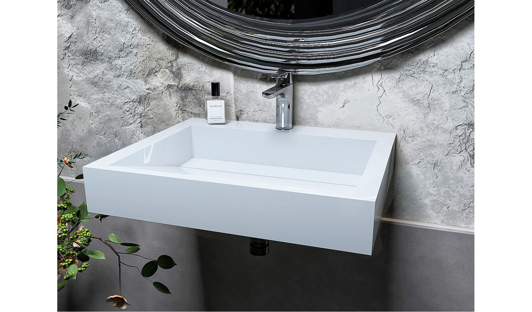 Глубокая прямоугольная чаша оборудована декоративной накладкой, которая изящно прикрывает слив. Умывальник имеет достаточную площадь для размещения гигиенических принадлежностей. Преимуществом также являются идеально ровные края и совершенно гладкая поверхность умывальников, что обеспечивает легкое удаление загрязнений при помощи обычных моющих средств и ополаскивания водой.