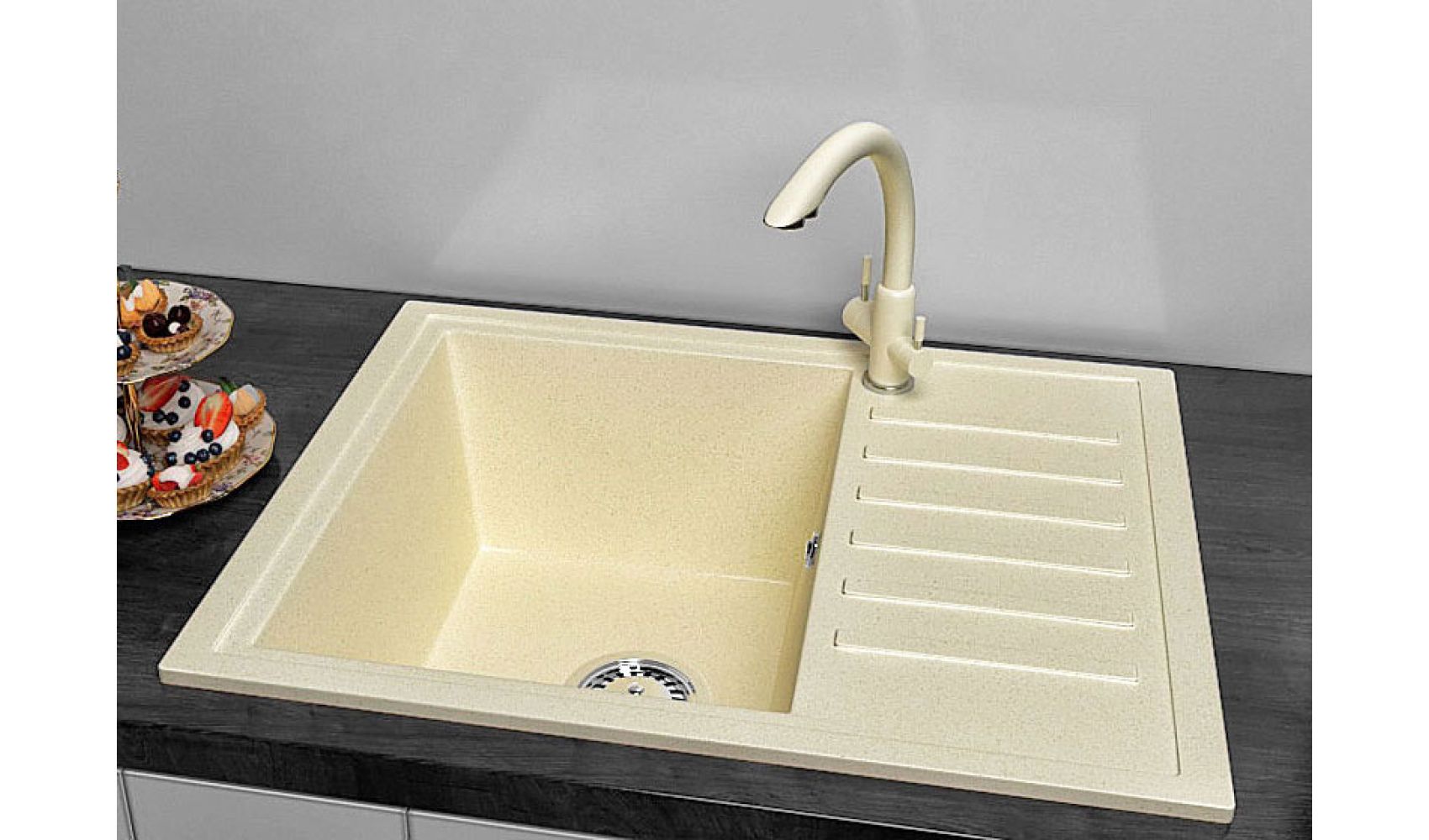 Теги: прямокутна мийка, бежева мийка, кухонна мийка з однією чашею, кухонна мийка з крилом, гранітна кухонна мийка, мийка + кран