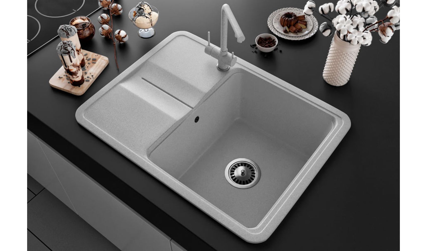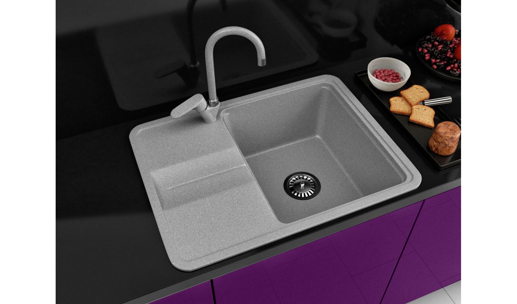 Теги: прямокутна мийка, сіра мийка, кухонна мийка з однією чашею, кухонна мийка з крилом, гранітна кухонна мийка