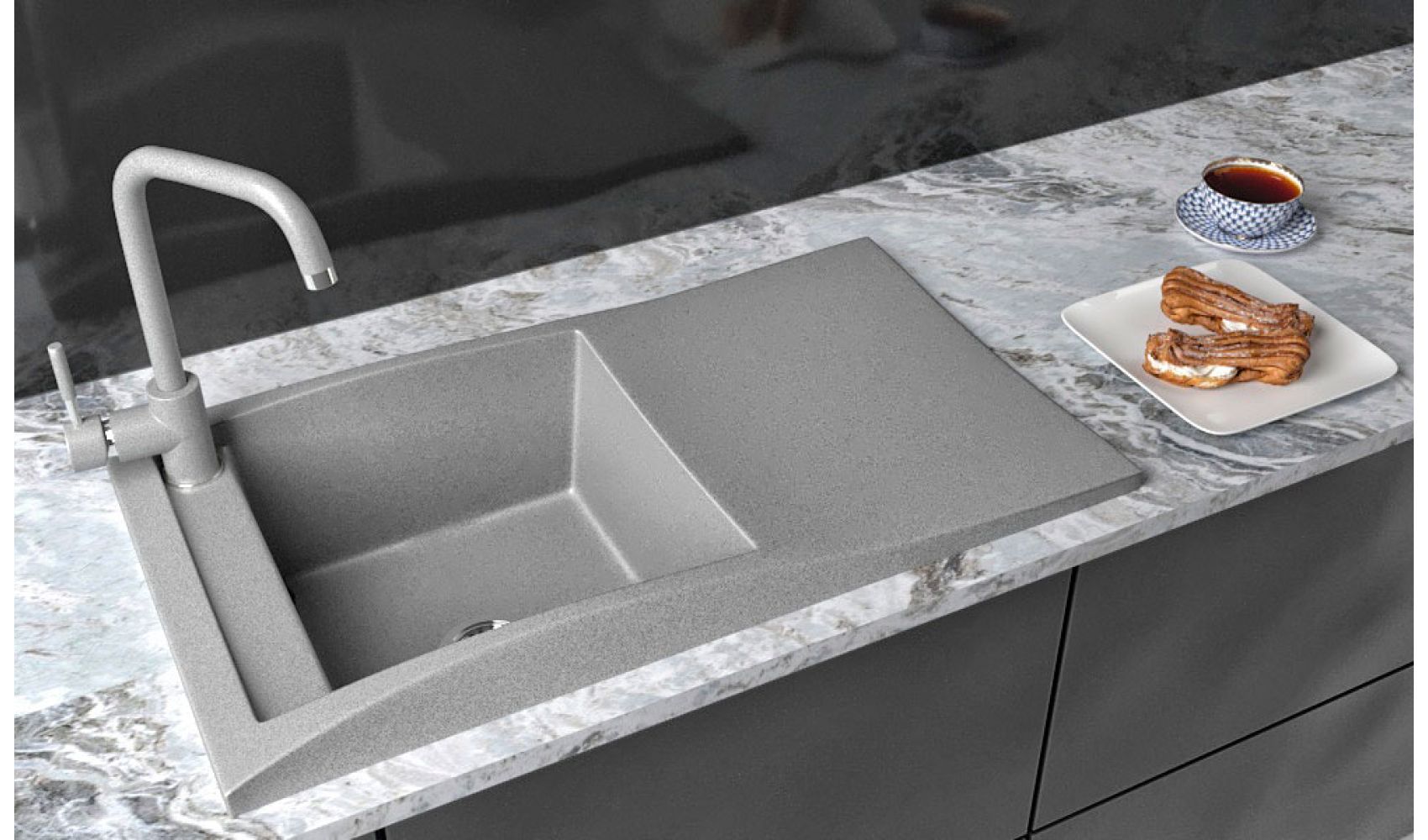 Теги: прямокутна мийка, сіра мийка, кухонна мийка з однією чашею, кухонна мийка з крилом, гранітна кухонна мийка