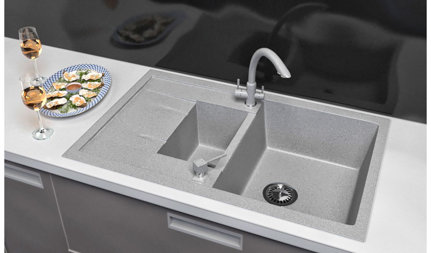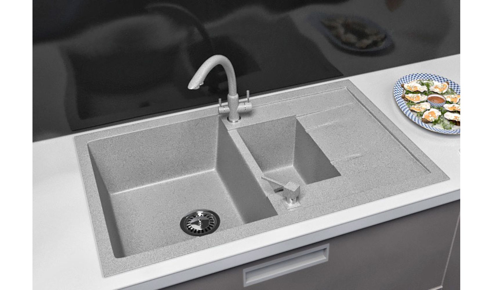 Теги: прямокутна мийка, сіра мийка, кухонна мийка з двома чашами, кухонна мийка з крилом, гранітна кухонна мийка