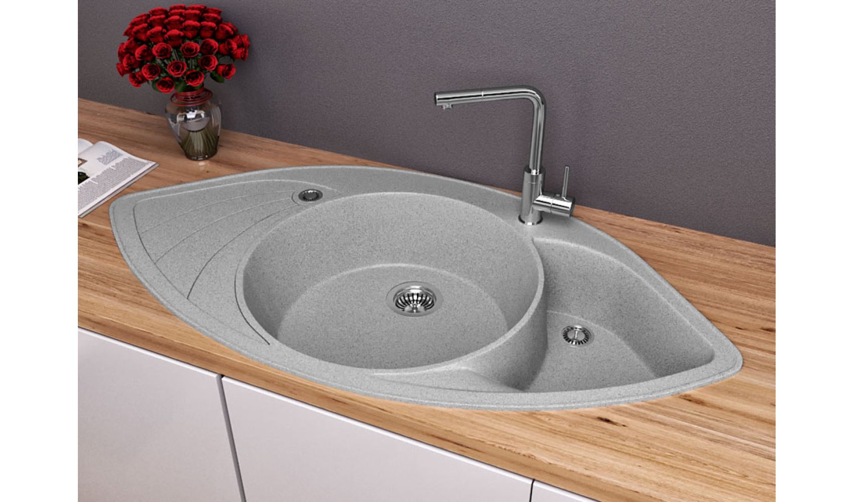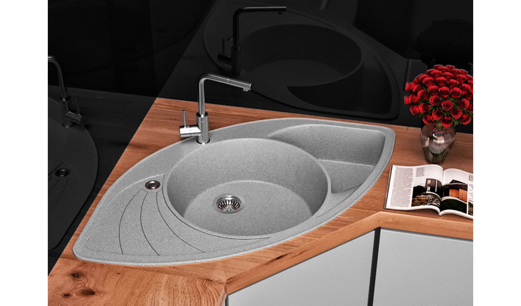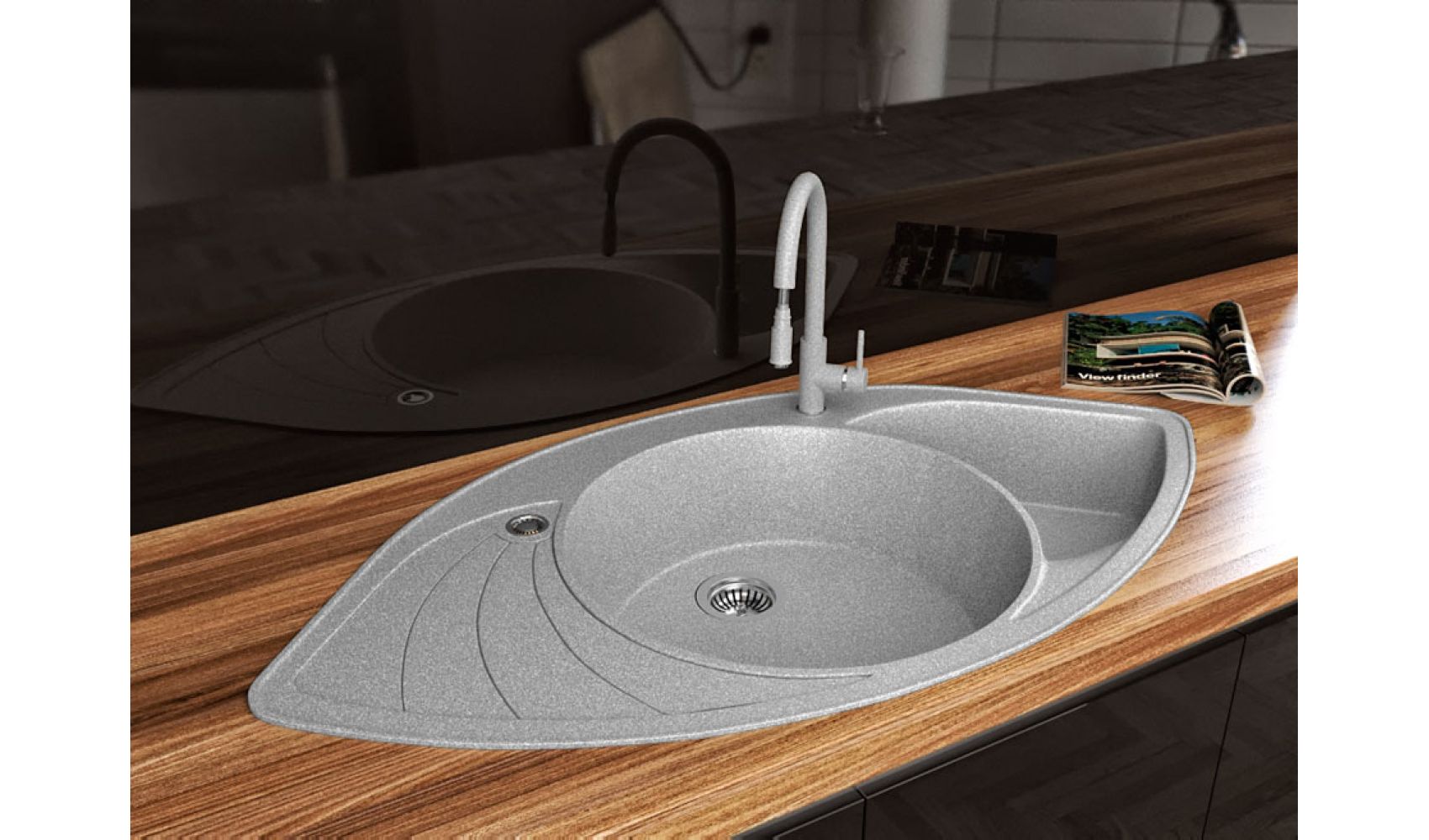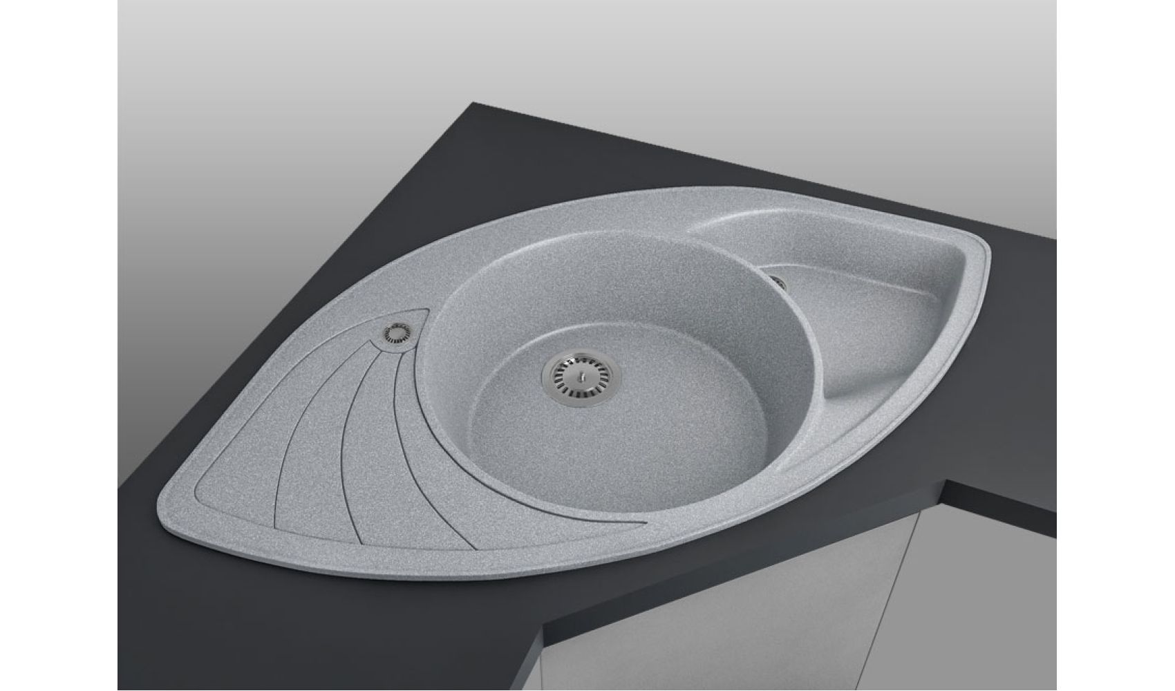 Теги: кутова мийка, сіра мийка, кухонна мийка з двома чашами, кухонна мийка з крилом, гранітна кухонна мийка