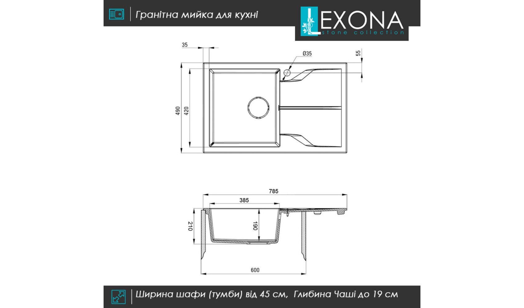 Кухонна гранітна мийка Lexona Granta ідеально підійде до вашого інтер'єру, а завдяки стильним лініям на крилі та багатій кольоровій гамі, підійде під будь який інтер'єр. Також кухонна мийка може бути доукомплектована сифоном, дозатором та змішувачем у колір мийки, а також для вашої зручності раковина є оборотною та отвір під змішувач уже присутній.